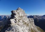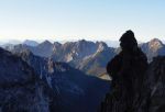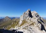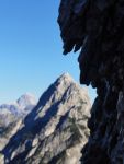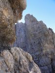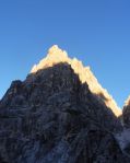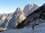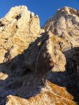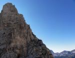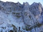 Naslednji dan pa ob prvem svitu odhod naprej – vzpon skozi Findeneggov ozebnik na vrh Montaža, kjer sva si privoščila zajtrk. Spust po občiajni poti na jug po Pipanovi lestvi, kjer so že začele prihajati prve trume s Pecola. Midva sva se še ravno prav izognila gužvi in se usmerila na pot Elenita Leva – to je prva etapa prečenja, ki poteka pod Špikom nad plazom in Špikom nad Cijanerico, potem pa se strmo spusti v ostro Škrbino nad Cijanerico (Forca del Palone, 2242m).