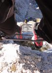 S škrbine vzpon na Špik Hude police (Cima di Terrarossa, 2420m), ki je z juga najlažje dostopen in je bila gor res gužva, zato sva takoj šibala naprej. Tik pod vrhom se pot Leva zaključi, naprej pa se nadaljuje Ceria Merlone, ki preči travnate poličke Špika nad Tratico do Škrbine nad Tratico (Forca de lis Sieris, 2274m). Od tam spet vzpon na Špik nad Nosom (Foronon del Buinz, 2531m), kjer prav na vrhu gradijo nov bivak. Prostora bo za 8 oseb, odprt bo pa predvidoma junija 2012. Ne vem zakaj ravno na vrhu, vsekakor bo pa dobrodošla vmesna postaja na tej dolgi poti.