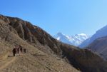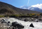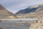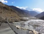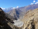 Okoli 12h smo se torej končno odpravili in se napotili ob reki Kali Gandaki navzgor. Prvi dan je bil sicer bolj za ogrevanje, vse skupaj skoraj nič vzpona, ampak tu je bilo že pomembno, da smo se postopoma in čim bolje aklimatizirali. Približno 4 ure hoje (z vmesnim postankom na masala tea) smo imeli do vasice Kagbeni na 2807m. Precej pusta pokrajina v globoki dolini, kjer so bili razgledi dokaj omejeni. Je pa zanimivo kako je na južnih obronkih Himalaje vse zeleno, polno vode, na drugi strani pa prava pustinja, saj se večina padavin ustavi na tisti ogromni pregradi. Kljub tisti pustinji je bil prvi dan torej lep uvod v spoznavanje te povsem drugačne pokrajine.
