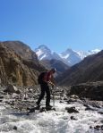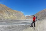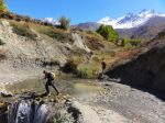 Pol skupine je šlo po isti poti nazaj do Jomsoma, ostali pa smo šli po drugi poti po sosednji dolini. Tu je šlo za ozko pešpot, redko obiskano, bolj strmo in občasno celo malo izpostavljeno – vsekakor pa bolj zanimivo! Še bolj zanimivo je, da je bila pot markirana, markacije pa so sumljivo spominjale na italijanske!?! Do sosednje doline je bilo seveda treba čez prelaz, nosači so rekli, da se imenuje Lubra la in da je visok nekaj čez 4000m. Kakorkoli že, s prelaza se odpre fenomenalen razgled daleč naokoli, ki ga lahko v dolini samo slutiš! S prelaza smo šli pogledat še na bližnji vrh, potem pa po strmi poti v globoko dolino ob majhni reki, ki ji še vedno ne vem imena.