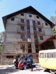 Po dolini Azau smo prispeli v majhno smučarsko letovišče Cheget na 2100m pod mogočnimi 3- in 4-tisočaki. Mestece je sestavljeno več ali manj samo iz nekaj hotelov, trgovinic in restavracij ter manjše tržnice. V sredini stoji ogromen napol zgrajen in hkrati že na pol podrt hotel, mi pa smo se zapeljali kar pod tistim propadajočim delom v idiličen gozd sredi katerega je stal naš hotel – tudi šele na pol zgrajen, ampak v notranjosti precej lepši in modernejši kot smo si upali pričakovati. Nisem še videl tako vesoljske tuš kabine – saj sem se že bal, da me bo kam teleportiralo!? 😉