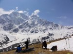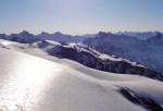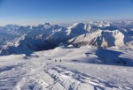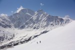 Kljub jutranjemu soncu, se je kmalu nad nas pripeljal oblak in skril sonce, kar je bilo še dobro, saj je bilo že tako pretoplo in tudi sneg je bil precej južen, tako da si nismo obetali prav dobre smuke. Vseeno smo šli do vrha in ko se je spet začelo jasniti, odsmučali nazaj. Zgoraj na grebenu so nam Avstrijci malo steptali sicer povsem razmočeno podlago, nižje pa je kar kmalu postalo boljše, pravzaprav naravnost odlično! Kar malo presenečeni smo odvriskali po tistem enkratnem pobočju – tokrat precej nižje navzdol. To se je izkazalo za dobro odločitev, saj smo se žarečih obrazov prismučali do konca snega, od koder smo imeli še kakšnih 10min peš prečno direktno do srednje postaje sedežnice. Ko smo odsmučali, smo še malo poležali na mehki travci, na toplem soncu, pod kuliso impozantnih štiritisočakov in vpijali še zadnje vtise… mmm še danes imam kar sladek okus v ustih, ko se spomnim na tisto smuko! 😉