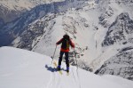 Na vrhu pa še vedno veter, zato smo se kar hitro začeli vračati nazaj. Malo za nami je na vrh prišel še Jaka sam in nas kasneje tudi ujel, saj je smučal s sedla (oz. bolj drsel in trpel kot smučal). Do sedla je bilo treba kar previdno, tam pa smo srečali našo drugo ekipo, ki je vrh dosegla okoli 13:30, razen Tomaža, ki je obrnil že nižje – ampak poskusil in uspel naslednji dan! Bravo vsi!