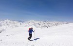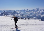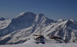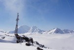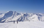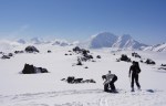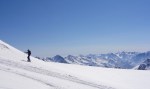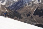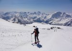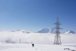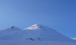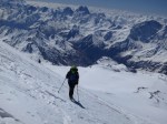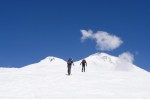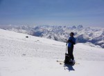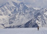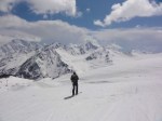 Za 10€ za povratno karto so sedežnico zagnali samo za nas, peljali pa smo se samo do prve postaje na cca 2700m. Tu je bilo snega že dovolj, da smo šli naprej peš ob smučišču. Smučišče tu in pod Elbrusom sicer ni bilo ne označeno, ne ratrakirano. Višje nad smučiščem smo prečili na krasna širna pobočja idealna za smuko, le malo nas je skrbelo, da bo preveč južen sneg, saj nas je sonce neusmiljeno žgalo celo pot. Na vrhu smo celo uro uživali na toplih skalah, popolnoma sami v osrčju belih velikanov in občudovali divje stene in grebene, v ozadju pa se je nad vsemi dvigal dvoglavi Elbrus in nas vabil k sebi.