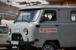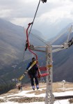 Naslednji dan smo se odločili za aklimatizacijo pod Elbrusom, čeprav smo vedeli, da bomo tam še kar nekaj dni. Vendar smo hoteli priti čim višje, hkrati pa smo si spotoma lahko ogledali naša bivališča, ki so nas čakala za naslednje dni. Zapeljali smo se skozi malo večje mestece Terskol in naprej do konca doline, kjer stojita dve gondoli: stara nihalka, ki bo kot zgleda kmalu kar razpadla in čisto nova jajčka. No, stara je bila za pol cenejša (7,5€ povratna), zato smo pač tvegali in se zapeljali v dveh etapah na 3500m.