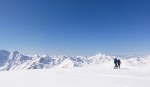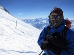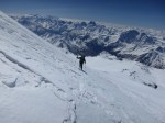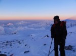 Na sedlu se odpre pogled na ogromno strmo pobočje, kjer gre spet prečka vse do grebena. To je tudi tehnično edini zahtevnejši del, saj je strmina kar precejšna (40°) pa tudi tu je bilo vse ledeno. No, ampak od sedla naprej mi je šlo spet nekako lažje – ne pa seveda nič hitreje! Tam sem se odločil, da se bom fokusiral na štetje korakov in nekako sem prišel do številke 22, ki se mi je zdela nadvse primerna. In tako je šlo, 22 in 22 in 22… in dobro uro kasneje smo prišli do grebena. Tam smo se združili še s Simonom R., ki je pobegnil naprej ampak se pod vrhom malo izgubil, in še z enim Latvijcem. Nismo točno vedeli kako visoko moramo izstopiti na greben, povrhu pa še greben ni bil greben ampak so se pred nami odprla prava prostranstva, tako da na začetku sploh nismo vedeli kje je vrh. No, še nekaj korakov in pokazalo se je, da tisto, kar smo ves čas gledali iz doline sploh ni vrh, ampak je ta nekoliko zadaj. Pa ni bilo več daleč in tudi vzpona skorajda ni bilo več, tako da sem celo malo “pospešil” na 33 korakov. Prišlo je olajšanje in le še nekaj malega truda do vrha…