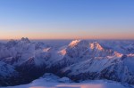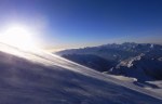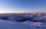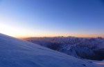 Tokrat smo bili pri skalah hitreje in tam smo tudi pustili smuči, saj je bilo že čedalje bolj ledeno in ni imelo smisla vztrajati. Brez smuči in z derezami na nogah smo bili precej lažji in z novim zagonom smo se podali proti prečki, ki naj bi nas izstavila direktno na sedlo med obema vrhovoma. Nad skalami smo tudi dočakali rojstvo čudovitega in popolnoma jasnega novega dneva. Prelepo, človek bi kar obsedel, ampak veter nam ni nič popuščal, tako da je bilo prav naporno narediti vsaj nekaj fotk brez rokavic, potem pa spet naprej.