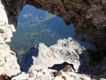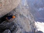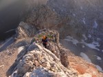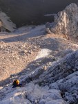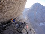 Z vrha sva se najprej precej spustila, potem pa čez Dolško škrbino (2270m) in naprej čez zanimiv prehod, ki ga je zelo lepo opisal Stanko Klinar: “…tisti dvakrat trebušni prehod nad Dolško škrbino: prvi trebuh je ogromen skalni previs, ki ga je gora obesila na pot, tako da je sredi popolnoma navpične stene navidez zaprla vsak prehod; drugi trebuh pa je naš, na katerega se vržemo pred njenim veličanstvom, da nam dovoli, da se po vseh štirih odplazimo po vodoravni temačni prekriti polici skozi to steno z vso težo previsa na hrbtu, v zlato svobodo Jezerske Kočne.” Ha! 🙂