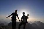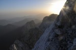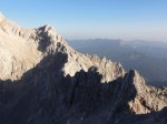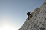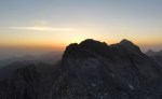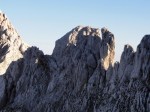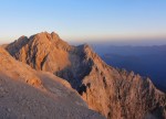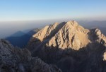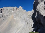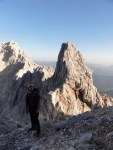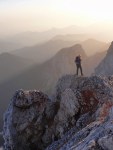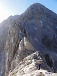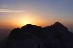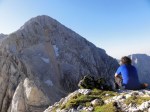 Ker sva imela nekaj glasnih in ne preveč uvidevnih cimrov, sva bolj malo spala, ob 4h pa sva se že odpravila naprej. Tudi takrat je bilo že dovolj svetlo, da je šlo brez lučk. Na Mlinarsko sedlo (2334m), potem pa po grebenu čez Mali Jezerski Grintovec (2447m), kjer naju je tudi pozdravilo sonce. Pot gre potem po meliščih na severnem pobočju Grintovca, ki pa naju niso preveč mikala, zato sva jo ubrala kar naravnost po SV grebenu direktno na vrh (2558m)! Fajn plezarija za malo jutranje telovadbe, le precej krušljivo je.