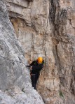 Od jezera sva se najprej vzpela skozi gozd do koče Zacchi (1380m), potem pa čedalje bolj strmo in naporno navzgor. Razen nekaj norih gamsov, ki so plezali po stenah in veselo prožili kamenje (k sreči daleč od naju), nikjer nikogar. Gor sva šla po ferati, ki je bolj kratka, ampak kar zahtevna. Sicer pred kratkim obnovljena in vzorno opremljena. Le tisti markacist ni imel ravno občutka za estetiko. Verjetno mu je tudi zato zmanjkalo barve, tako da se je treba v zgornjem delu orientirati po možicih…