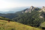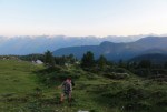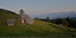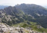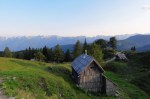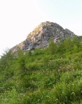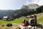 V iskanju prehodov sva šla nad Mišeljsko dolino, do naslednje – to je Dolina za Debelim vrhom. Prečno preko severnih pobočij Debelega vrha (primerno ime!) sva preko razbitega pustega sveta prišla na travnati Lazovški preval (1966m). Tam sva se spet priključila markirani poti do planine V Lazu (1560m), se osvežila v bistrem potočku in nazaj do planine Blato, kjer sva končno sklenila najino klobaso!