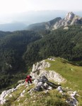 Do Mišelj vrha (2350m) je treba po grebenu občasno malo poplezati, ampak nič težjega. Čeprav sva šla gor po ovinku, se je splačalo – na presenetljivo prostornem travnatem vrhu je prava idila, ki kar kliče po poležavanju in uživanju v prostranih razgledih!