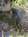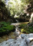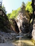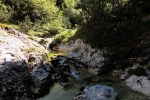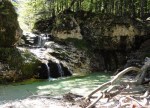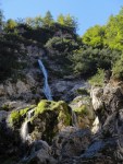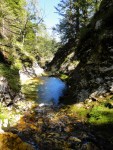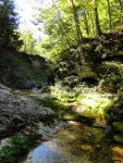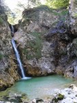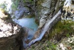 Ker pa sem prihajal od zgoraj, me je zanimalo, če je možno priti do vrha zgornjega slapu – čeprav je bilo jasno, da bi se potem moral vračati nazaj. Od planine navzdol sem torej sledil strugi, ki pa se kmalu zapre v ozko sotesko, potoček pa postane nadvse živahen in poskakuje iz enega tolmunčka v drugega. Res lepo! No, čez čas se je soteska toliko zožala, da ni šlo naprej, vseeno pa še nisem takoj obupal. Splezal sem na rob in potem po vrhu sledil soteski skozi gozd. Pa mi je tudi tu hitro zmanjkalo tal pod nogami, potoček pa je padal nekam daleč v temno globel. Torej je to pravzaprav (izgubljeni 😉 ) šesti slap!? Je pa tudi ta povsem nedostopen, tako da sem se vrnil nekako povprek do markirane poti in sestopil pod prag, potem pa prečno prišel do vhoda v sotesko.