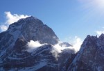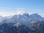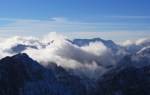 Tik pod vrhom sem se priključil poti, ki pripelje od Belopeških oz. Mangartskih jezer in je bila že shojena, čeprav jih tudi tu ni veliko hodilo. Tako sem končno prišel do vrha, kjer spet stoji nov križ. Razgled z vrha je res vrhunski, hkrati pa sem bil še na varnem pred oblaki, ki so se medtem že začeli dvigati in požirati grebene in vrhove…