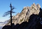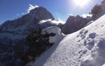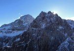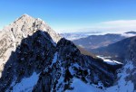 Nad gozdom se je počasi nehalo predirati in z derezami na nogah sem hitro nadoknadil. Po grapi sem bil kmalu na Rateški škrbini (Forc. di Ratece, 1851m), kjer se odpre lep pogled na drugo stran – in pa proti cilju, ki je še kar daleč. Sledi razgledno prečenje po oz. pod grebenom. Razmere so bile prav vse mogoče in na splošno kar zoprne in naporne. No, ampak na grebenu me je končno pozdravilo sonce in s takimi širnimi pogledi vse naokoli je bilo vse lažje! 😉