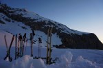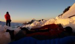 Sonce je že zašlo in hitro je postalo mraz, zato smo si uredili sobo z razgledom, pojedli večerjo in se zavili v spalke. Ponoči je bilo okoli ničle, tako da zeblo nas ni – le luna je tako močno svetila, da je bilo res moteče! No, pa vseeno smo kar solidno spali in seveda zjutraj ni bilo nikomur do vrha, saj bi se bilo treba za to najprej spraviti iz tople spalke… 🙂 Škoda, saj zgleda res lepa flanka pa tudi razmere bi bile odlične. Pa drugič!