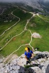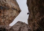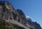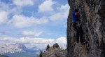 Zadnji dan sem nekako upal na kakšno krajšo pohodno turo, na koncu pa smo šli spet plezat – in to spet nad prelazom Falzarego. Ker smo zjutraj še pospravljali kamp, smo bili pod steno šele okoli 11:30, tik pred nami pa še ena naveza. Malo smo počakali in potem počasi napredovali proti vrhu – tokrat v dveh trojnih navezah: Anže s Petro in Tanjo ter Miha, Roman in jaz.