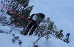 Izplezali smo tik pri Češki koči, ki je zavita v idilično zimsko spanje tam v čudovitem okolju pod Grintovci. Čakal nas je še sestop in veseli smo bili gazi naveze pred nami. Snega je sicer veliko, polno je klož, tista prečna pot pa že itak ni najbolj ugodna v zimskem času. Poleg tega je gaz že prehitro zavila navzdol. Da ne bi gazili naprej, smo ji sledili in upali na najboljše. Na koncu smo se preko ruševja pod suhim snegom prebili do nekaj metrskega skalnega skoka, čez katerega smo rajši abzajlali. Ne najbolj udobno, a na koncu smo varno prišli na trdna tla in po ogromni plazovini sestopili do doline. Pestra in poučna tura v vedno lepem okolju.
