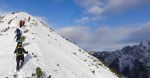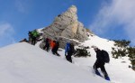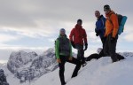 Vzpeli smo se na vrh prelaza in tam na soncu opravili izpitne formalnosti. Kljub soncu nas je začelo počasi zebsti, zato je bil nadaljni vzpon zelo dobrodošel. V koloni smo lepo zgazili do Prednjega Robičja (1941m), občasno v globokem snegu, med delno pokritim rušjem in na vetrovnem grebenu. Popoldne se je delno pooblačilo, ampak razgledi so bili vseeno odlični. Za konec še spust do ceste in v mraku smo zadovoljni in prijetno utrujeni prišli nazaj do Koče na Goozdu.