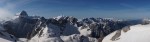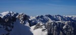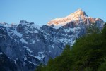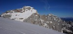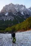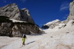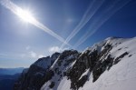 Sončen in topel majski dan (z izjemo tistega dežja zjutraj v Mojstrani, nič jasno!?), zato sva bila v Vratih še v temi. Kakšno uro do snega, še nekaj časa peš čez strmi del, nato pa na smuči in po širokem smučišču vse do vršnih skal Križa. Do vrha je le par minut, tudi zajla je že zunaj. Je bilo pa kar nelagodno videti kako blizu roba je vodila gaz – markacije pa so izpod snega gledale kar nekaj metrov nižje! Kar nekaj opasti še čaka na grebenu!