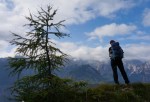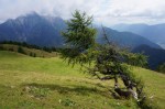 Naprej proti severu, preko travnikov Bavhe in čez Mojstrovico (1816m), ki je kot ustvarjena za uživanje – bodisi v razgledih, slikovitih macesnih ali pa v mehki zeleni preprogi. Skozi macesnov gaj do sedla in pod Tišlerico (1757m). Že dvakrat sem jo obvozil, tokrat pa sva šla še na vrh – in se spet tako navdušila nad še enim lepim kotičkom, da sva kar malo obsedela.