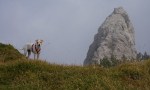 Vreme je še kar držalo, oči so se že sprehajale po grebenu naprej – ni druge, kot spet na noge! Preko planine Grajšca na Kresišče (1839m). Tu mi ne gre v račun zakaj mu Avstrijci pravijo Schwarzkogel (z višino 1842m), nam pa je Črni vrh malo bolj vzhodno. Kakorkoli, zdaj smo že na glavnem grebenu Karavank. Proti zahodu do Maloškega poldneva (1823m). Ko smo že pri zmedah: severno od njega stoji malo nižji skalnat vrh Ostra peč (1802m), ki ga Avstrijci imenujejo Mallestiger Mittagskogel (torej Maloško poldne). Morda bi bilo treba za razjasnitev na obisk v Malošče pogledat kateri vrh jim kaže poldne. Vsekakor pa so Avstrijci tu bolj pogosti obiskovalci, saj imajo na svoji strani celo nekaj markiranih poti. Na Kresišču sva tako tudi srečala edinega človeka v celem dnevu!