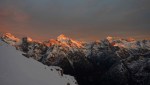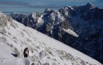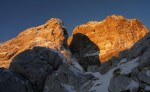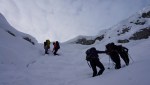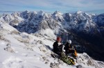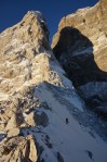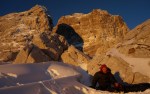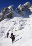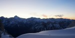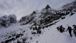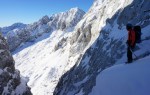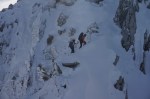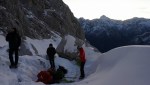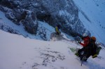 Z grebena smo tako sestopili po izredno zoprnem pobočju: strme trave, skale, skrotje, vse skupaj pokrito s svežim snegom, spodaj pa precej zraka. Dober trening za živce! Čas pa je hitro mineval, ko smo tako previdno sestopali in ko smo bili na varnem, je sonce že kmalu zašlo. Noč bo že tako predolga, zato smo nadaljevali še v mraku vse do Jalovške škrbine, kjer smo v še zadnji svetlobi našli prostor za bivak. Precej tesnoben in temačen kraj med črnimi grozečimi stenami. Pa nam ni bilo hudega – med taljenjem snega in večerjo so se pokazale zvezde in ko smo se zavili v tople spalke, smo kmalu odsanjali v dolgo noč…