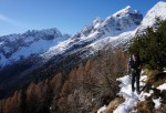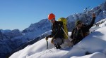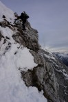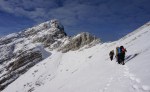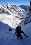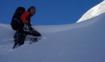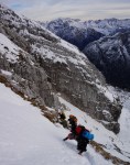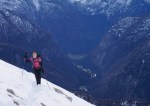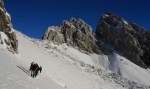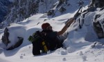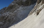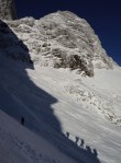 Poizkusimo torej okoli Goličice, v okviru markirane poti proti Jalovcu. Tudi tam nam ni dišalo in smo šli v tretje še naprej v sosednjo grapo, ki naj bi nas pripeljala prav tako gor do markirane poti. Ne prestrma, a z globokim snegom, nas je grapa dobro ogrela (še dobro, da je bila v senci!), na vrhu pa – slepa ulica! Na drugo stran prepad, nad nami stene. Torej tudi v tretje ne bo šlo.