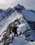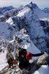 Sprva enostavno in uživaško (z izjemo kakšnega udora med skalami, kjer je bilo treba previdno!) čez, recimo, Srednjo Mojstrovko in naprej na Zadnjo. Tam nas je zapustila še Slavi, nas pa je čakala prva resnejša popestritev. Sestop je bil s težkimi nahrbtniki malo neroden, a kmalu je šlo spet lažje navzdol in navzgor na Travnik. Še naprej po grebenu proti Šitam, a ne do vrha, saj greben tam pade v globoko Jalovško škrbino.