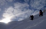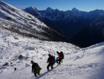V soboto se nas je kar 9 zbralo na precej samotnem Vršiču, kjer nas je malo presenetila visoka oblačnost. Še vedno bolje kot trdovratna ljubljanska megla! Po klasiki proti Mojstrovki je manj snega kot bi pričakovali, da ne govorim o vročini! Zavili smo proti Veliki Mojstrovki, kjer smo začeli s prečenjem, takoj ko smo se poslovili od Tanje in Romana.