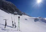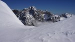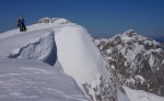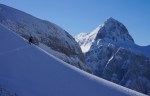 Kakšne gneče ni bilo, vsi pa so se odločili za smučanje čez Sovatno. Zgornji del je res zgledal lepo, ampak sem se bal, da bo smuke zelo kmalu konec. Zato sem prečil nazaj pod Stenarskimi vratci in še malo nižje pod Križem. Potem pa spet peš naravnost navzgor do grebena, tik pod vrhom Križa. Tudi tam začuda nikogar, niti gazi proti vrhu. Jaz sem se seveda potrudil za tistih 5 minut vzpona.