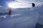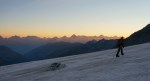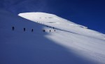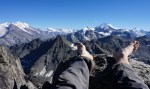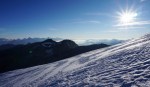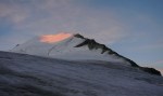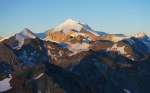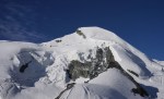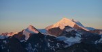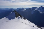 Do vrha je le okoli 900 m vzpona, tako da smo začeli ob zori in že na začetku poti uživali ob rojevanju dneva. Vzpon je res razgleden, v spodnjem delu ledenika je nekaj razpok, višje ni kakšnih težav. Kljub višini Bishorn deluje skoraj kot le predvrh mogočnega Weisshorna, ki z vrha tudi zavzema velik del razgleda.