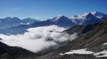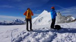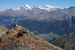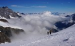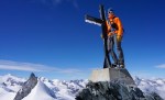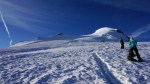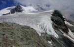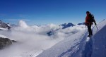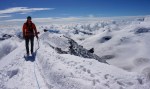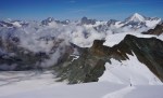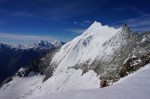 Tako sva šla po normalnem pristopu: zjutraj v Saas Fee, z gondolo in nato z vlakcem do Mittel Allalina (3456 m). Tam še celo poletje smučajo, kar je bilo nekam nenavadno, ko sva se prebijala ob smučišču navzgor. No, višje kmalu postane bolj zanimivo in predvsem razgledno. Tudi ta vzpon je nezahteven, a tudi tu je nekaj razpok. Vrh je iz očitnih razlogov zelo obljuden, tudi med tednom je bilo precej ljudi, med vikendi je najbrž obupno. Srečala sva tudi eno hrvaško navezo, ki naju je prepoznala, svet je res majhen.