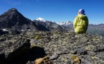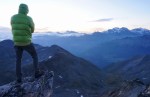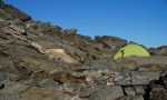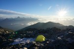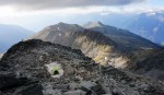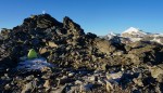 Nekoliko južneje od mojega grebena se dviga najvišji vrh na tem območju, to je Schwarzhorn (3201 m). Najvišji pomeni tudi najširši razgled, zato me je mikalo, da bi prespal prav na vrhu. Markirana pot se sicer zaključi na Dreizehntenhornu, oziroma se tam usmeri navzdol in Schwarzhorn zgleda precej neprijazen s strmim meliščem. Vendar se na bližnji pogled najdejo možici, ki kažejo prehode. Najbolj me je skrbelo, če bom našel prostor za bivak: raven, po možnosti v zavetrju in s snežiščem v bližini za vodo. In očitno bo že držalo, da če si nekaj močno želiš (in si bil celo leto priden), se ti to tudi izpolni! Tik pod vrhom me je namreč čakala manjša kotanja, skrita pred vetrom in z zaplato snega. Več kot odlično torej! Šotor sem postavil kar na sneg, kjer je bilo najbolj ravno, kuhinjski kotiček sem si uredil takoj zraven, tako da sem imel tudi zalogo vode pri roki.