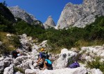 Z Miho, Anjo in Katjo smo se torej dobili ob Belem potoku in se že takoj, ko smo zapustili cesto znašli v samotni in idilični dolini pod manj poznanimi, a kljub temu impresivnimi, drzno oblikovanimi špicami in grebeni. Med potjo nas je ujela noč, z njo pa luna, ki nam je svetila, da je bilo kot sredi dneva. Na razgledni terasi v zatrepu doline stojita dva bivaka – v enem sta se namestila dva Italijana, v drugem pa mi. Večerja, igranje skrivalnic s kozorogi in uživanje nočnih razgledov, nato pa zaslužen spanec.