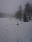 Najprej na planino Konjščica, nato pa po še sveži špuri na greben Slemena. Avtorja sem ravno ujel na vrhu, da sem se jima zahvalil za udoben vzpon, potem sta odsmučala nekam proti jugu. Jaz sem si spust zamislil malo bolj severno, zato sem šel po grebenu naprej in odsmučal naravnost proti planini. Sicer sem se moral ukvarjati z iskanjem prehodov, a smuka je bila enkratna in tudi smer sem lepo zadel.