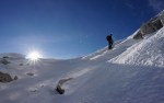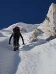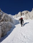 Na plazu snega ni. Grozno, kakšna obupna pot je to v kopnem! Tudi višje je snega malo, a tudi tu so razmere super. Ivo je bolelo koleno še od prejšnjega dne, zato je malo pod vrhom obrnila, midva pa sva pospešila naprej na Veliko Mojstrovko. Sonce naju je do takrat že lepo ogrelo, pred nama pa uživaški greben. Šla sva čez Srednjo Mojstrovko, nato pa pod Zadnjo navzdol in spodaj spet nazaj do Grebenca. Zelo uživaško – če le ne bi potem zmanjkalo snega…