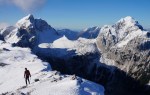Jutro na Vršiču je bilo grozno mrzlo, a kljub temu smo zgodaj zagrizli v breg. Zoran in Iva še nista prehodila grebena Mojstrovk, jaz se pa takšne ture tudi nikoli ne bom naveličal, sploh na tak lep dan.