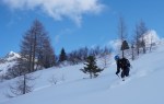 Nazaj na planini smo se malo pogreli, nebo se je zjasnilo, ura pa šele dvanajst. Menda ne gremo kar domov?! No, ena ekipa je zaključila, z Majo in Marušo pa smo ponovno zagrizli v breg. Zagledali smo se v mikavno poseko v gozdiču takoj severno nad planino, ki se je izkazala za zadetek v polno. Snega je bilo tam več kot dovolj, ki so ga ostali spregledali, saj je bilo treba dovolj visoko prečiti, da smo prišli do naše nagrade.