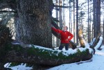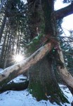 Zjutraj je bilo pri Riherjevi kmetiji še pošteno mrzlo, a pot kmalu postane strma in sem se hitro ogrel. Nekaj jih je plezalo slap Cuc, jaz sem ga šel pogledat na poti nazaj. Višje ob poti sem se ustavil pri Riherski jelki (hojki), ki tam vztraja že več kot 250 let! Glavni vrh je oklestila strela, a starka se ne da in poganja stranske veje, ki že segajo med najvišje vrhove.