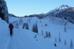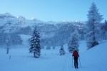 Popoldne smo se zapeljali na sever, saj na Koroškem letos še vedno ni snega. Našli smo lep in poceni penzion v Untertauernu in se zjutraj zapeljali nekaj kilometrov nazaj na Vordergnadenalm. Tam je bila zgodba povsem drugačna kot prejšnji dan: jasno nebo, zimski mraz in kakšnih 5 cm novega snega za pravljično vzdušje.