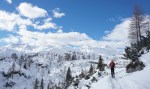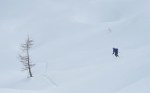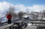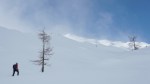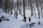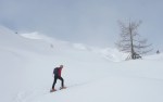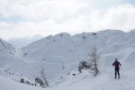 Do sedla spet malo mešano, pod sedlom zelo lepo po pršiču, nato pa še nekaj časa po mulatjeri, kjer sva čez čas spet nataknila pse in se v čedalje lepšem vremenu sprehodila nazaj do koče. Tam smo se še malo martinčkali na terasi, nato pa smo se morali soočiti s sestopom. Iva je šla že od koče peš, Zoran je šel s psmi, jaz sem optimistično upal še na kak zavoj. V zgornjem delu je bilo v resnici prav v redu, saj je v gozdu snega dovolj (oziroma se ni prediralo preveč). Tudi nižje je šlo nekje do 35. ovinka brez težav, nato pa čedalje bolj na silo. Z Zoranom sva kljub temu vztrajala in brez nezgod prišla vse do 19. ovinka, a medtem naju je Iva že peš prehitela, tako da prav smiselno očitno ni bilo… Je pa sestop vsaj hitreje minil kot smo mislili. Skratka, kljub bolj žalostni zimi je na Komni lepo in tudi kakšna dobra tura se najde.