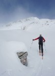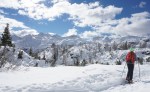 Smuka do sedla malo mešana, pod sedlom v senci še pršič, nižje južen sneg, nato pa še kar nekaj razdalje po planoti, kjer smo kmalu spet nataknili pse in se sprehodili do Doma na Komni. Precej hoje in bolj malo smučanja, ampak lepo je bilo vseeno.