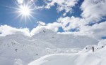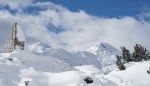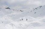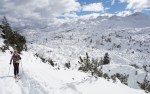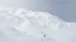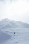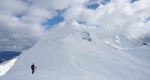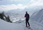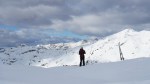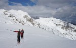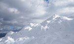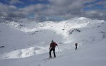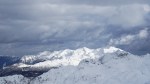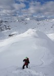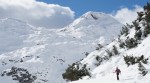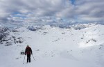 Po kratki pavzi smo se odpravili naprej do Bogatinskega sedla. V dveh dneh smo srečali le dva smučarja in precej pešakov, kar pomeni, da je bil vzpon po dodobra naluknjani mulatjeri na trenutke malo zoprn. Napovedana je bila ohladitev, nam je bilo pošteno vroče in tudi sneg na prisojnih straneh je bil že precej ojužen. Zato smo namesto proti Lanževici zavili na senčna pobočja Bogatina. Zadnji del do vrha smo šli peš, tam so nam oblaki že ukradli nekaj razgleda, veter pa nas je pregnal nazaj dol.
