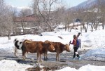 Kljub navdušenju nad Mestio bi se mi zdelo škoda spet obiskati isti kraj, ko pa je še toliko drugih po svetu… Zato smo se letos odpravili v Gudauri, ki leži ob nekdanji ruski vojaški cesti, dobrih 100 km severno od Tbilisija. Gre za edino cestno povezavo z Rusijo, poleg tiste ob Črnem morju na zahodu, tako da se po njej noč in dan valijo tovornjaki. Cesta je v bolj slabem stanju, a kljub temu je dostop do Gudaurija (sploh v primerjavi z Mestio!) precej udoben – v petek ob 7h zvečer smo poleteli iz Ljubljane in v soboto smo bili ob 8h zjutraj že na cilju! Po gruzijski uri tako zgodaj, da smo morali na “recepciji” še malo počakati, da nas je nekdo sprejel.