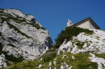 Nad Robanovo planino se dolina kmalu zapre in pot se vzpne po lepih prehodih preko strme stene in se prevali čez rob planote na Moličko planino. Tam me je pozdravilo sonce, pri stari Kocbekovi koči sem malo poklepetal z oskrbnikom in si ogledal lično kapelico na robu. Naravnost nad kapelico se vzpne stara Kocbekova pot na Malo Ojstrico, ki mi je bila z višino 2017 m dovolj v tem letu. Seveda je greben do Ojstrice zelo mikaven, ampak sem ga že večkrat prehodil in ga gotovo še kdaj bom. Za danes sem imel dovolj in sem se rajši vrnil po isti poti ter se takoj za robom spustil v blagodejno senco vse do dna doline.