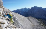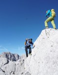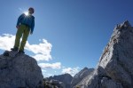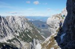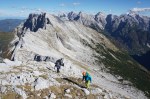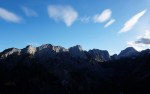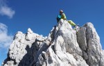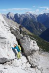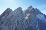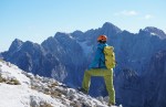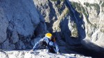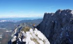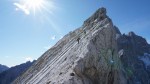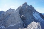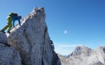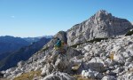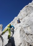 Ker sta imela Dolenjca nekaj več vožnje, nismo bili pretirano zgodnji, kar je bilo v redu, saj je zjutraj na Vršiču še grozno pihalo. Med vzponom do Velike Mojstrovke smo bili k sreči v zavetrju, ko smo prišli do grebena, pa se je veter že umirjal. Za malo popestritve smo na Veliko Mojstrovko splezali naravnost z juga preko krajše in dobro razčlenjene stene. Spet nov dostop torej.