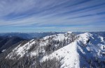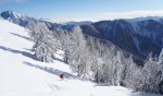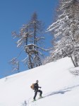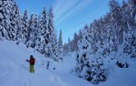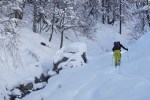 Spet smo se zapeljali v Srednji vrh in po dolgi cesti ob Hladniku ter navzgor na Murnovec, ki nas je sprejel v najlepšem zimskem okrasju in nam ponudil neverjetne razglede. Do vrha smo imeli tokrat za spremembo že špuro, vendar so predhodniki smučali bolj desno, tako da smo odvriskali naravnost navzdol in malo nad lovsko kočo ponovno vpregli pse za vzpon ob Žlebnici. Spodaj ob potoku je bilo res mučno in strmo, višje je šlo po idilični (in ledeno mrzli!) dolinici lažje, čeprav smo se kar dobro nagazili do sedla.