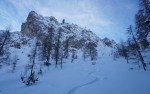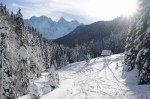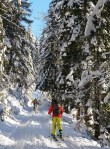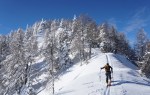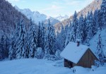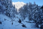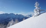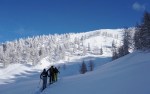Spet smo se zapeljali v Srednji vrh in po dolgi cesti ob Hladniku ter navzgor na Murnovec, ki nas je sprejel v najlepšem zimskem okrasju in nam ponudil neverjetne razglede. Do vrha smo imeli tokrat za spremembo že špuro, vendar so predhodniki smučali bolj desno, tako da smo odvriskali naravnost navzdol in malo nad lovsko kočo ponovno vpregli pse za vzpon ob Žlebnici. Spodaj ob potoku je bilo res mučno in strmo, višje je šlo po idilični (in ledeno mrzli!) dolinici lažje, čeprav smo se kar dobro nagazili do sedla.