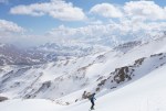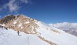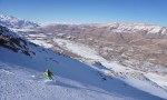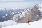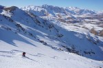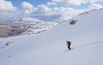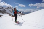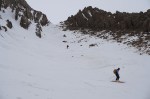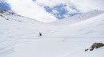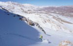 Tokratna tura je bila precej razgibana z nešteto možnostmi – saj bi lahko pet dni zapored tu smučali pa ne bi izčrpali vseh variant spustov! Sploh v zgornjem delu so se nam med prečenjem po grebenu za vsakim robom odpirala nova širna pobočja, da kar nismo vedeli kod bi se spustili. No, izbrali smo seveda najboljšo možnost in odvriskali navzdol po neskončnih smučiščih… Nižje se je svet zaprl v ozek kanjon, kjer je bila sicer skorja, ampak nam to ni pokvarilo navdušenja nad celotno turo.